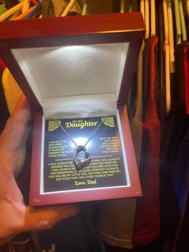 Two-toned box or Mahogany style box with built-in led spotlight that lights upon the necklace and the message card, making it more special.
